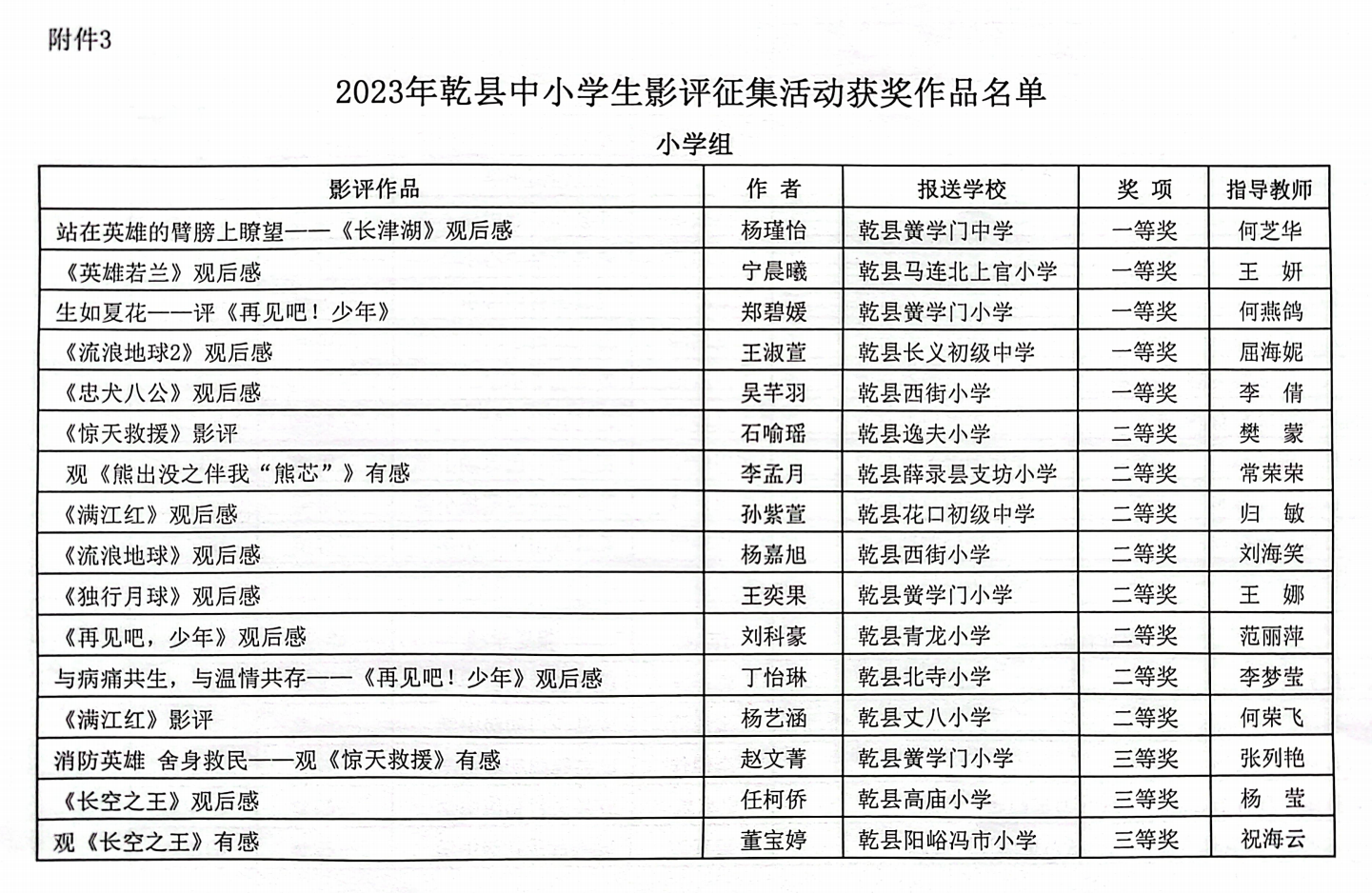 12月11日,乾县教育局发布通报,表彰2022年—2023年度乾县中小学生影视教育影评活动评选结果,同时将乾县在2022年微电影创作展映和影评征集活动省、市获奖名单一并公布。本次影评活动共征集影评468篇,经影评评审小组评选,评出县级优秀获奖作品90篇,并根据各学校在本次活动中的参与组织情况,评选出优秀组织奖5个。